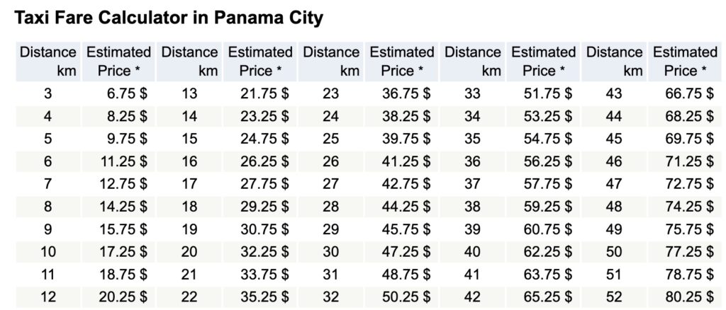 Taxi’s zijn voor zowel locals en toeristen een populaire manier om met name in de steden te verplaatsen. Ook zijn de taxi’s zeer betaalbaar mits ze via de meter rijden. Check even goed of je chauffeur de meter aan doet. Ik raad echter altijd aan om Uber te gebruiken, wat betrouwbaar en zelfs goedkoper is. In Panama rekenen ze ongeveer de onderstaande taxiprijzen (USD):
