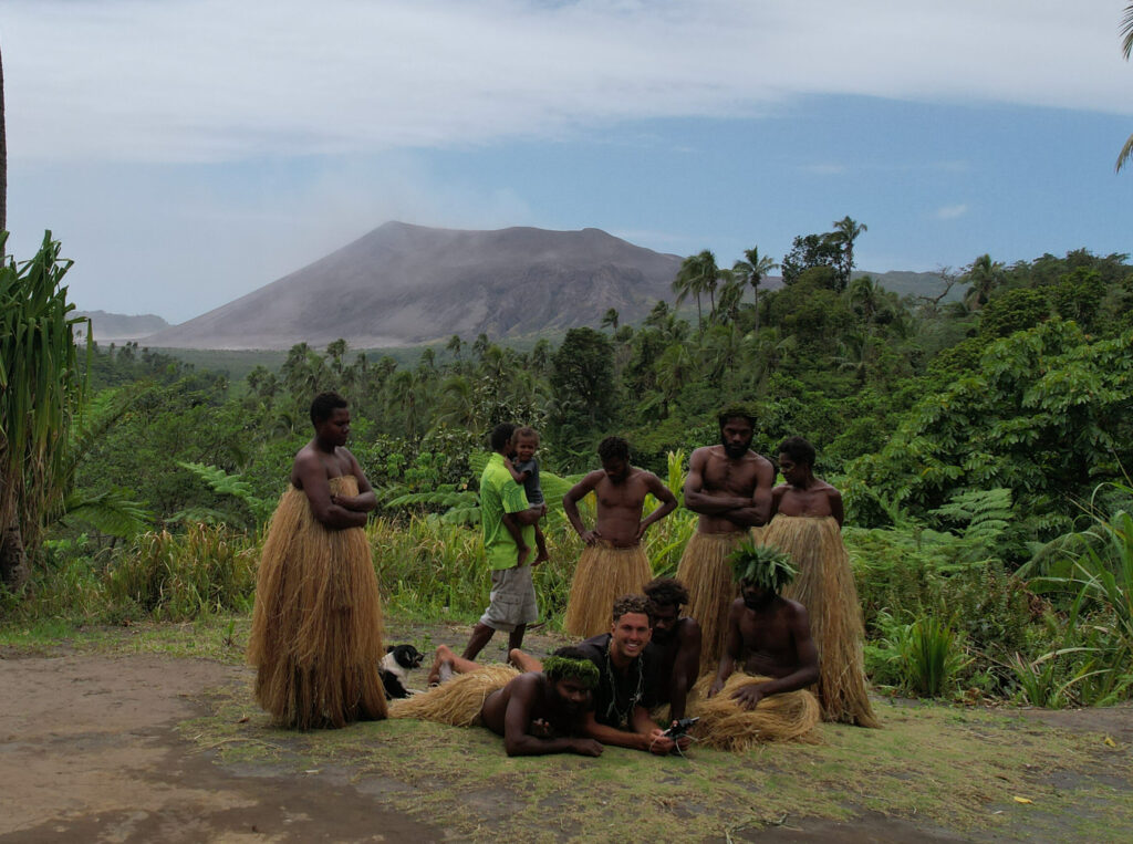 Een van de meest bijzondere ervaringen op Tanna is de John Frum-tour. Dit ritueel draait om een lokale “cargo cult”, ontstaan tijdens de Tweede Wereldoorlog. Toen kwamen duizenden Amerikaanse soldaten naar Vanuatu vanwege de strijd in de Pacific. Ze brachten allerlei spullen mee die voor de eilandbewoners magisch leken: trucks, radio’s, coca cola, medicijnen… Toen de Amerikanen na de oorlog weer vertrokken, ontstond het geloof dat John Frum, een soort mythische Amerikaanse soldaat, terug zou keren met nog meer “cargo” om voorspoed te brengen. Voor veel mensen op Tanna is John Frum een messiaanse figuur, bijna als een belofte van hoop en welvaart die nooit helemaal verdwenen is.