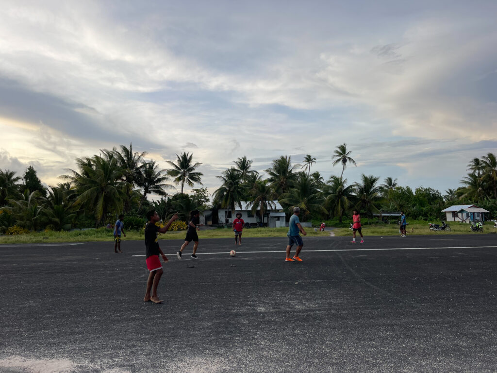 Geloof het of niet, Funafuti International Airport is de meest interessante plek om te bezoeken tijdens je reis door Tuvalu. Hier zal je dingen zien, die je nergens anders ter wereld ziet. Per week komen er drie vluchten aan en vertrekken direct weer naar Fiji. Het hele eiland lijkt in rep en roer als het vliegtuig nadert en een groot deel kijkt hoe het vliegtuig land. Alleen in deze periode wordt de overgang tussen het vliegveld even geblokkeerd. Als het vliegtuig weer weg is, wordt de landingsbaan weer gebruikt voor het verkeer en na zonsondergang als sociale ontmoetingsplek. Het is het enige grote stuk land dat ze hier hebben in Tuvalu en dus maken ze hier goed gebruik van. Elke dag rond 17:00 komen alle locals samen op de landingsbaan om te voetballen, volleyballen of ’te ano’ te spelen, een lokale sport hier in Tuvalu. De locals vinden het erg leuk als je samen met ze mee doet!