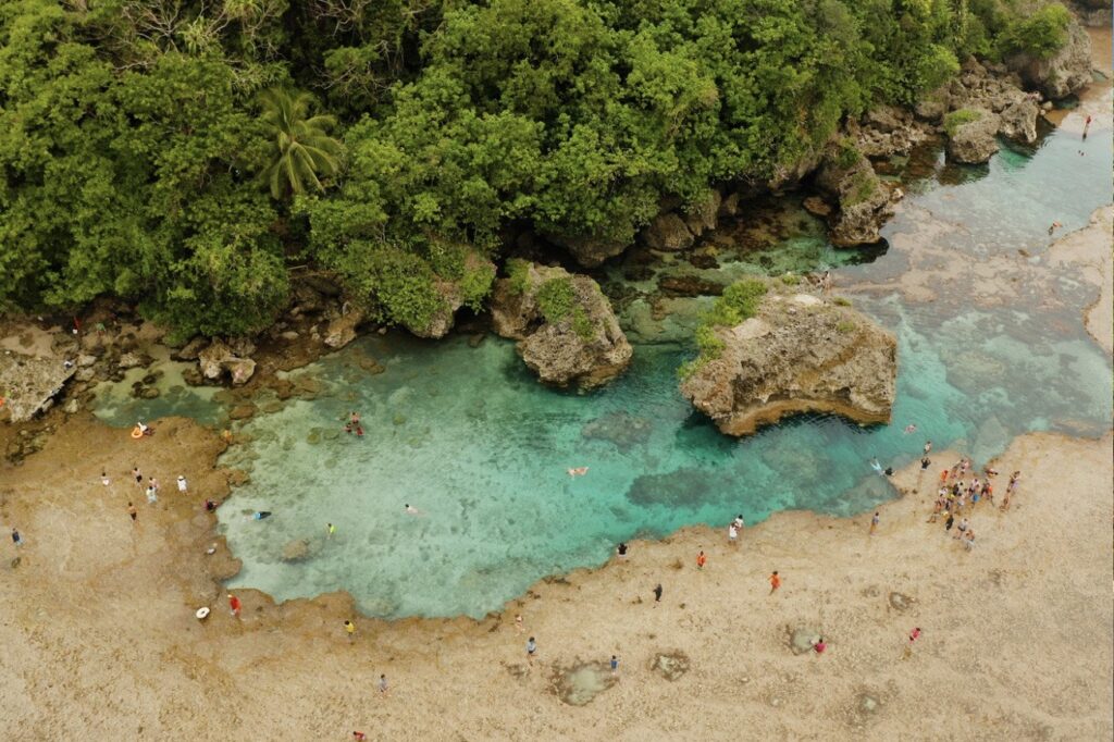 Magpupungko Rock Pools: een reeks natuurlijke rotsbaden met helder water die alleen bij laag tij goed te zien zijn. Perfect om te zwemmen, springen of gewoon te relaxen op de rotsen.
